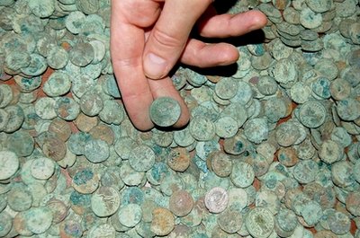 “Uma das maiores descobertas de moedas Romanas na Grã-Bertanha foi feira por um homem usando um detector de metais. O conjunto de mais de 52 000 moedas datadas do 3ºSéculo AD foram encontradas enterradas num campo em Somerset. As moedas estavam num grande vaso a cerca de 30cm de profundidade por Dave Crisp.” (podes ler a notícia completa na BBC – em inglês)