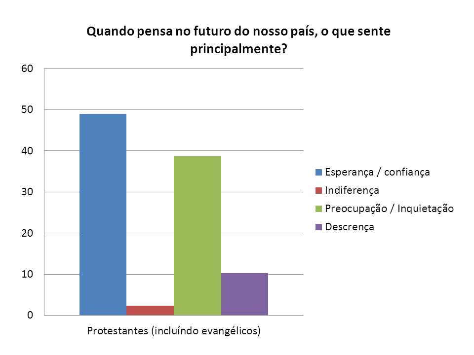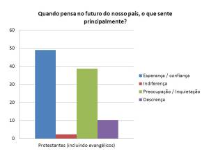 Por comparação, o grupo dos Protestantes / Evangélicos é o que se assume como maioritariamente praticante da sua fé (84,4%). Curiosamente, como demonstra o gráfico ao lado, são também o grupo que encara o futuro com maior Esperança / Confiança (48,9%). A fé viva produz esperança, mesmo no meio das tribulações, porque está arraigada em Jesus Cristo, que garante o nosso futuro glorioso. (Rm.5:1-11)